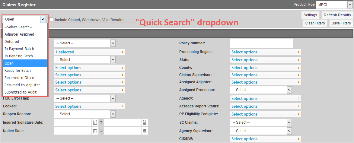 System-defined and, if applicable, user-defined search options available in the Quick Search dropdown vary by the view (MPCI, Private Products, or Inspections) selected from the Product Type dropdown on the Claims & Inspections Register.