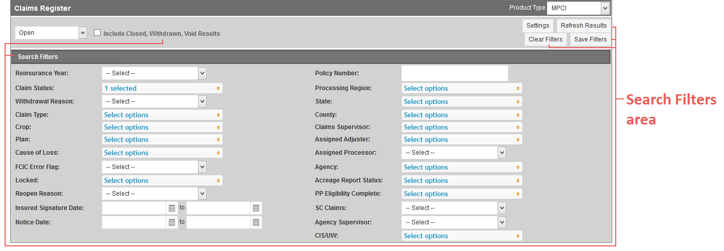 The filters available in the Search Filters area may change based on the view of the Claims & Inspections Register that the user is on, and the majority of the filters available are dropdowns. Some of the dropdowns only allow single options to be selected (e.g., the Reinsurance Year dropdown) while others allow multiple options to be selected at one time (e.g., the Claim Status dropdown on the MPCI view and the Agency dropdown on the Private Products view). An additional search filter—the Include Closed, Withdrawn, Void Results checkbox—is also available.