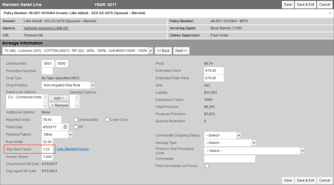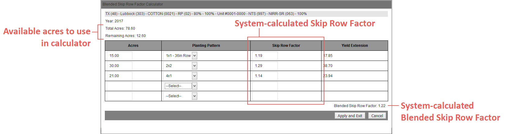 Clicking this hyperlink will open the Blended Skip Row Factor Calculator popup, which allows a user to add up to five lines of Skip Row acreage to be automatically calculated by the System into a Blended Skip Row Factor.