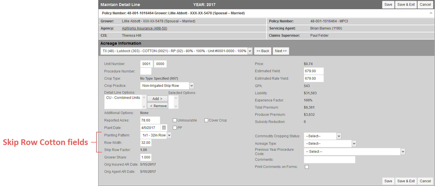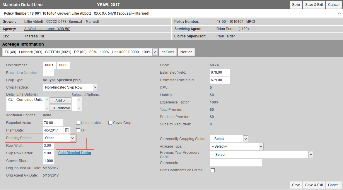 When adding/editing a Skip Row Cotton (0021) or Cotton ELS (0022) detail line, a Planting Pattern field displays.